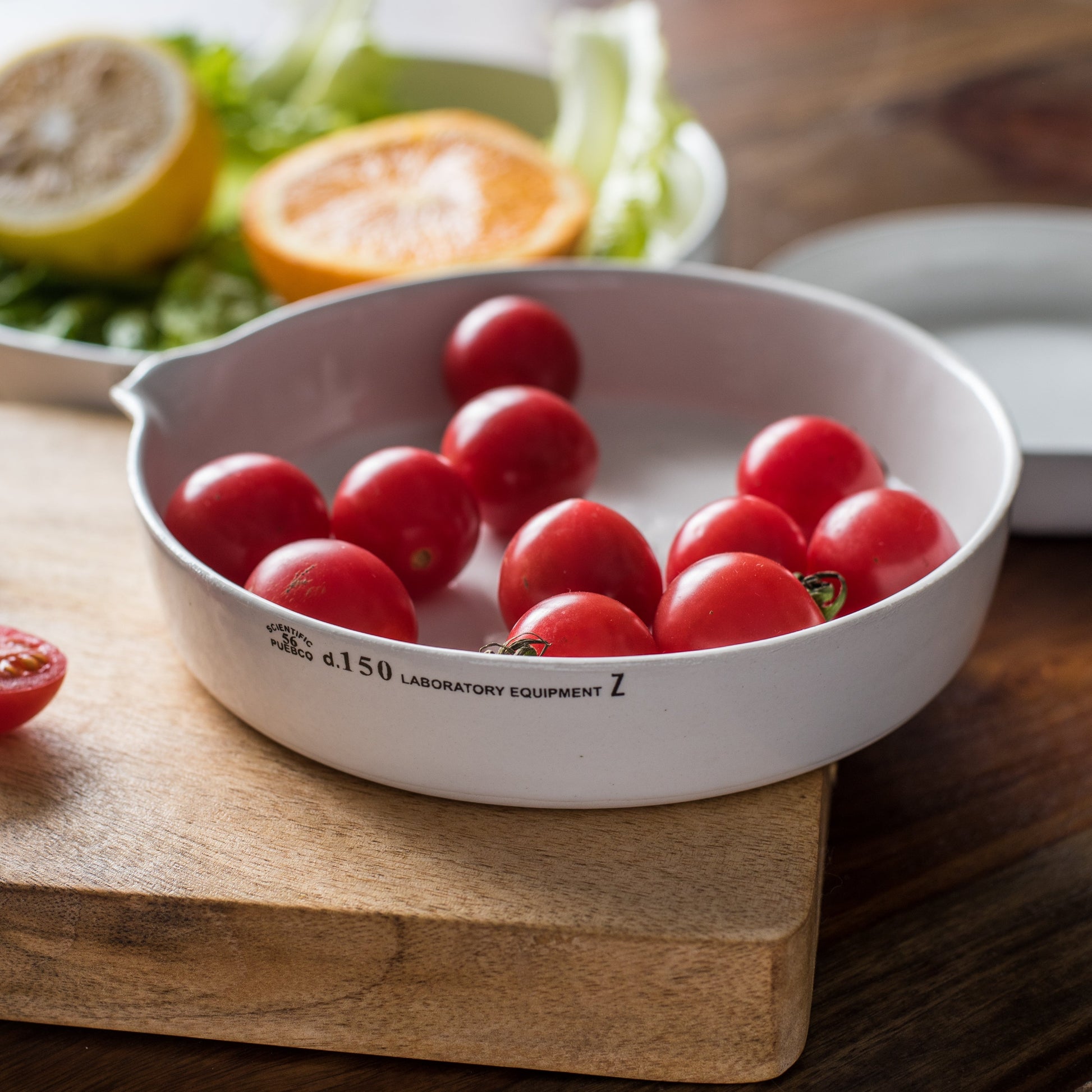 Persiapan makanan atau penyajian dengan piring yang terinspirasi dari peralatan laboratorium minimalis ini.