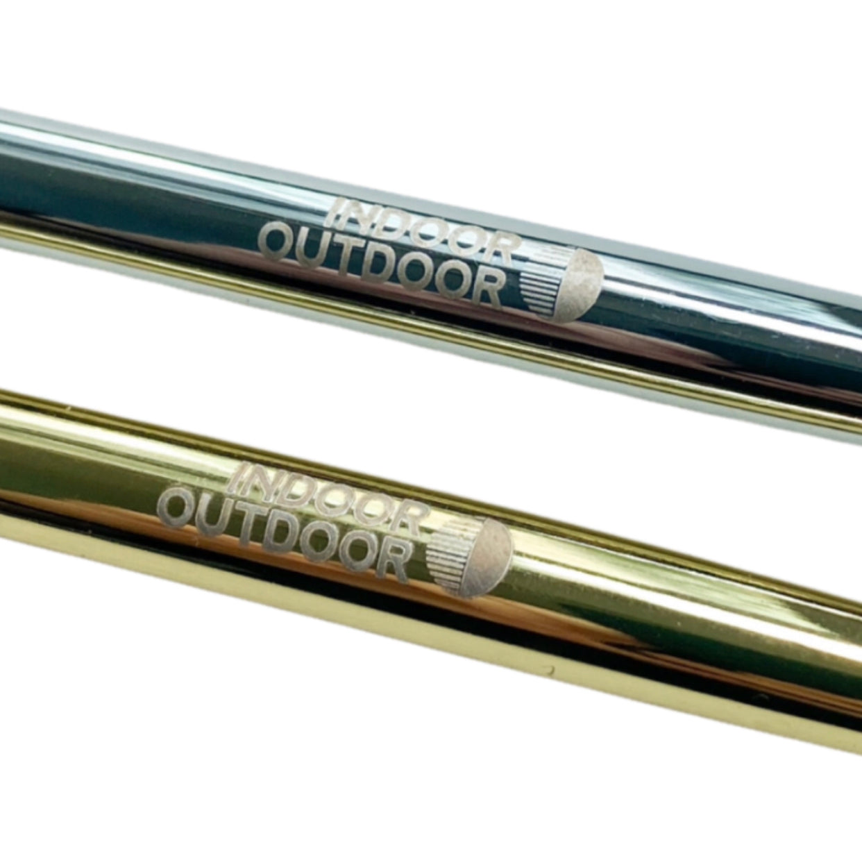 Pulpen peluru minimalis putar terbuka dengan logo terukir laser, tinta hitam.