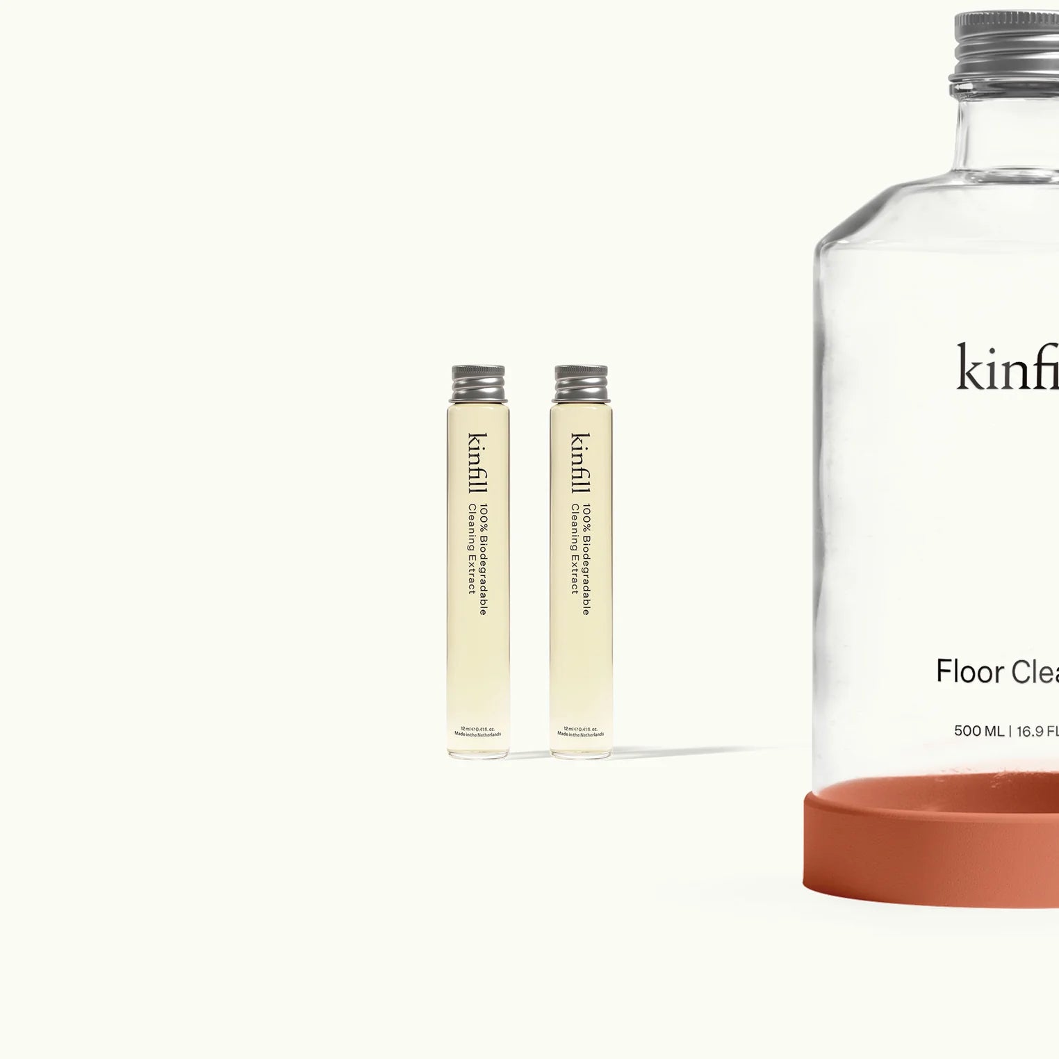 Pembersih Lantai Kinfill merawat lantai Anda dengan sangat baik dan diciptakan sebagai solusi untuk masalah plastik sekali pakai yang mengkhawatirkan. Konsentratnya memiliki pH 6,8 pada skala keasaman, yang berarti mendekati netral (7,0) sehingga aman digunakan pada lantai kayu, batu alam, atau beton.