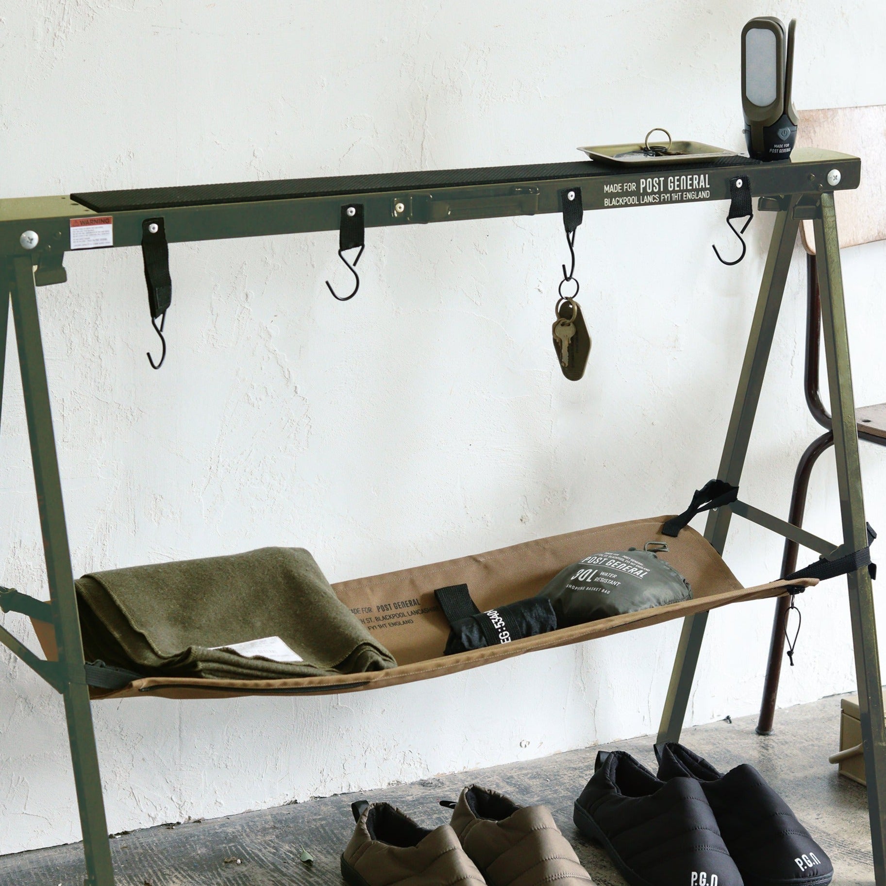 Gunakan sebagai rak gantungan untuk petualangan luar ruangan Anda atau sebagai kaki meja untuk meja kerja Anda. Cocok untuk menyimpan peralatan Anda agar tetap teratur di rumah, maupun di alam terbuka.
